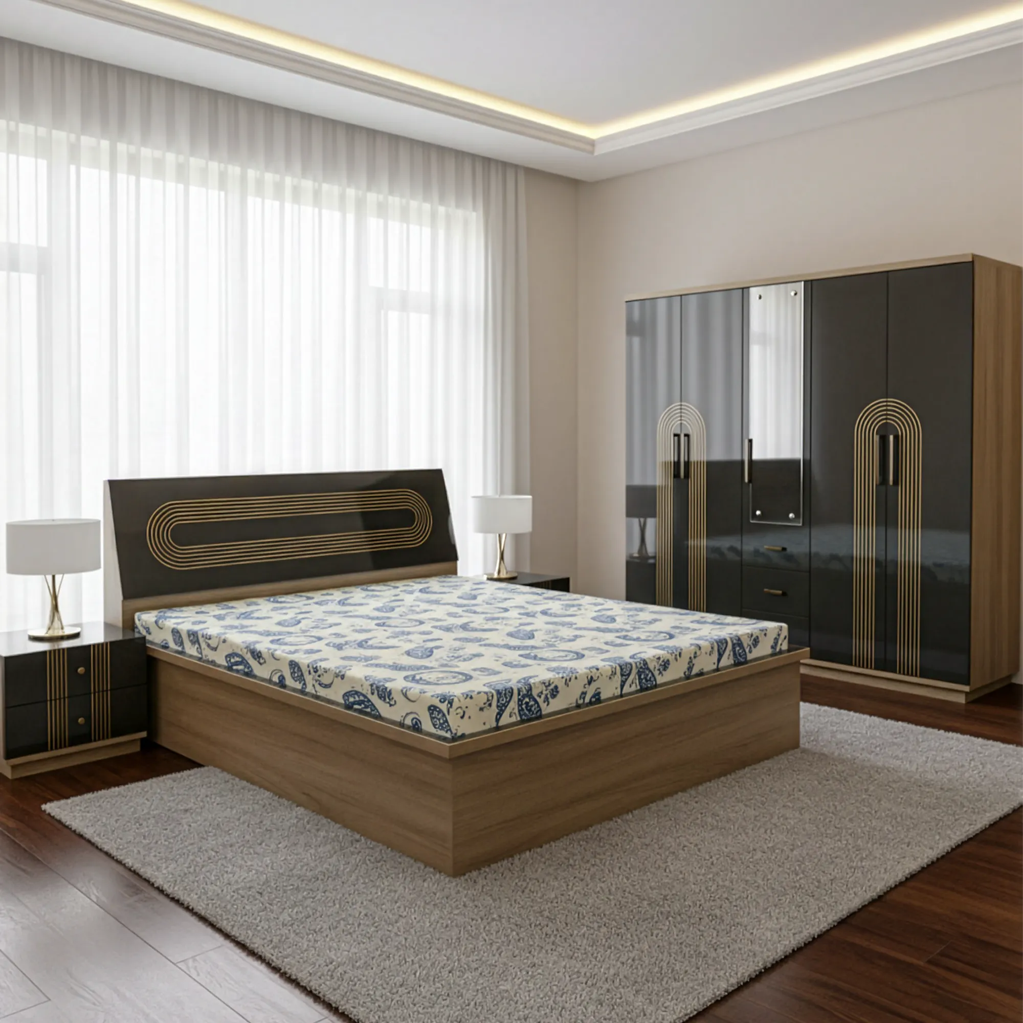 The majestic queen-sized bed features a tall, high-gloss headboard adorned with the signature gold arch inlay. Its robust platform base in a warm wood finish provides excellent support and includes a hydraulic lift mechanism, revealing a massive under-bed box storage compartment for all your essentials.