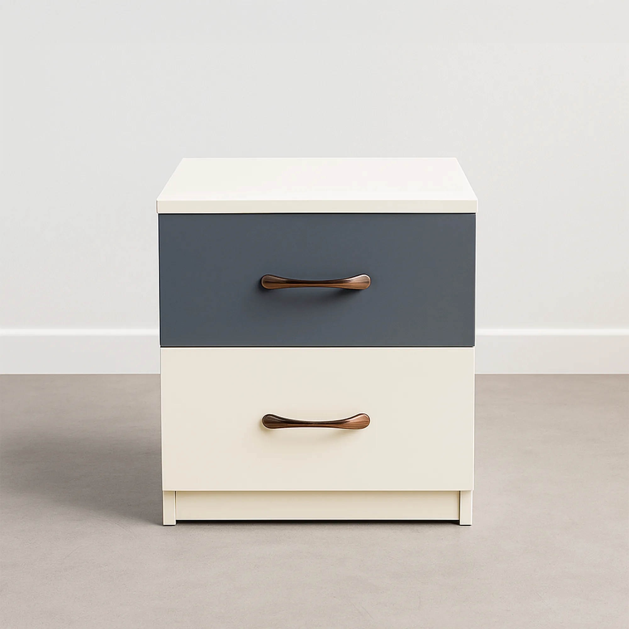 Two coordinating bedside tables frame the bed perfectly. Each features a two-tone design with drawers, providing convenient storage for all your nighttime essentials.