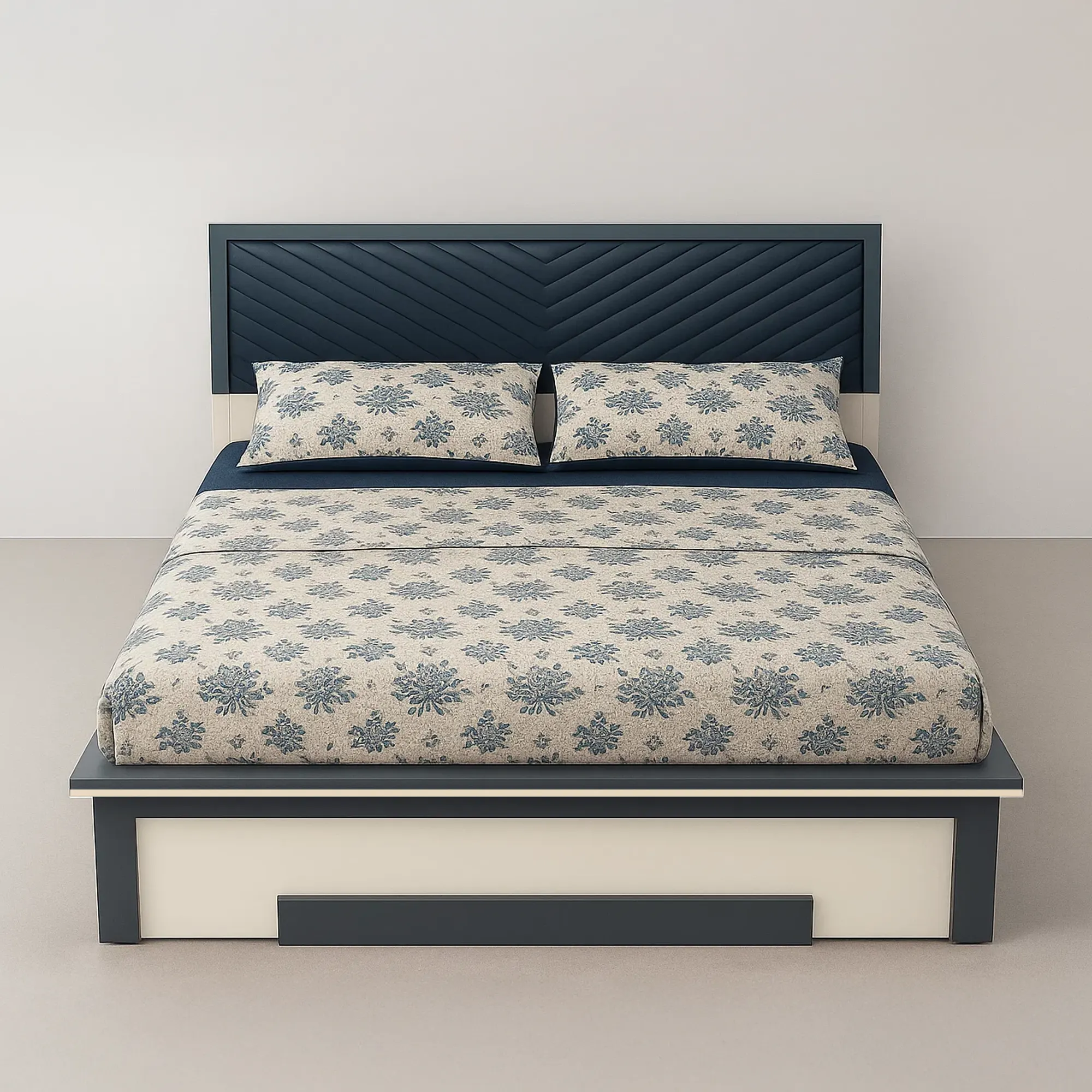 The magnificent queen-sized bed features a plush, navy blue headboard with an elegant chevron pattern. The robust platform base not only provides excellent support but also features a hydraulic lift mechanism, revealing a massive under-bed box storage compartment—ideal for keeping your room tidy.