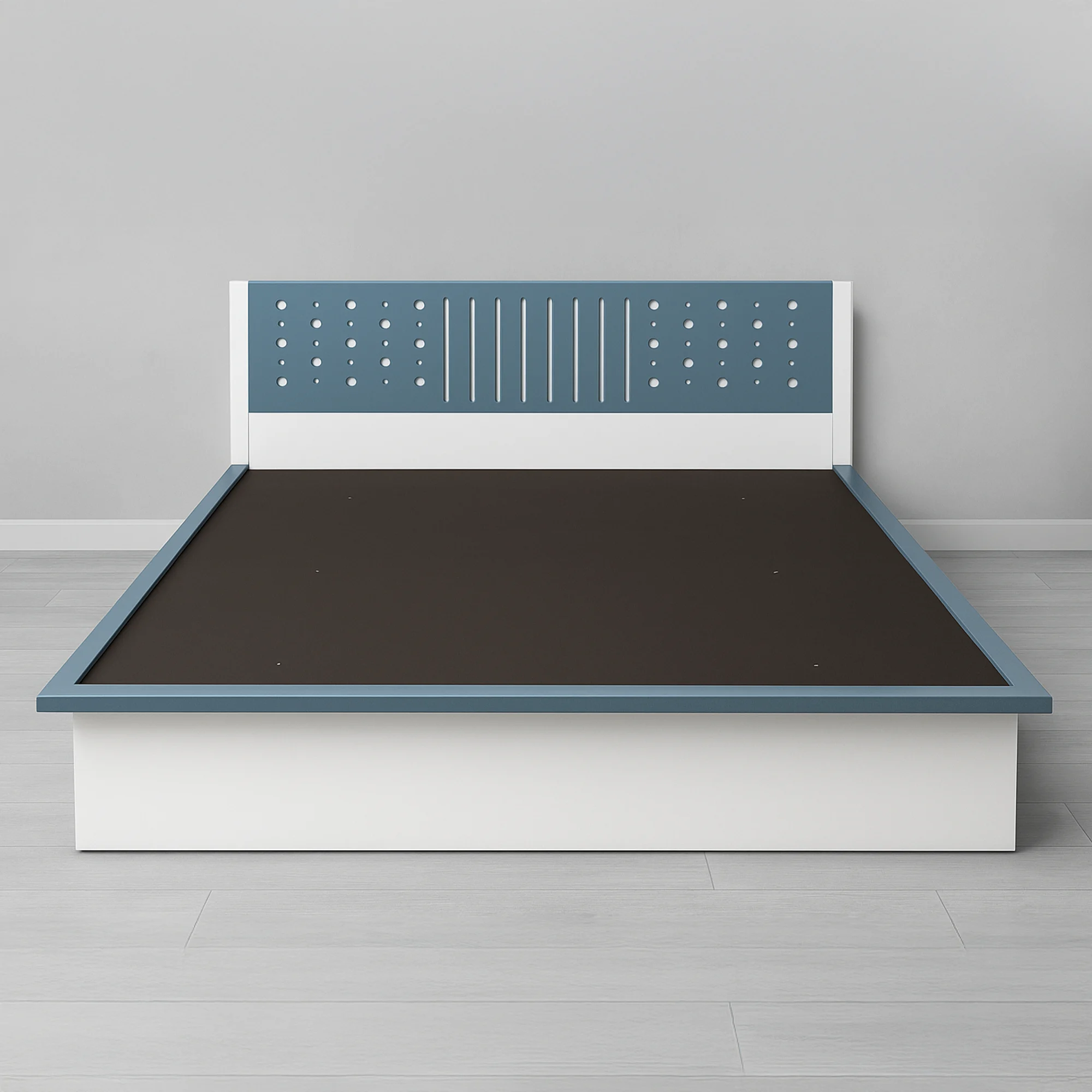 • Statement Designer Headboard: The unique two-tone headboard with its perforated and slatted design serves as a stunning focal point for any modern bedroom.
