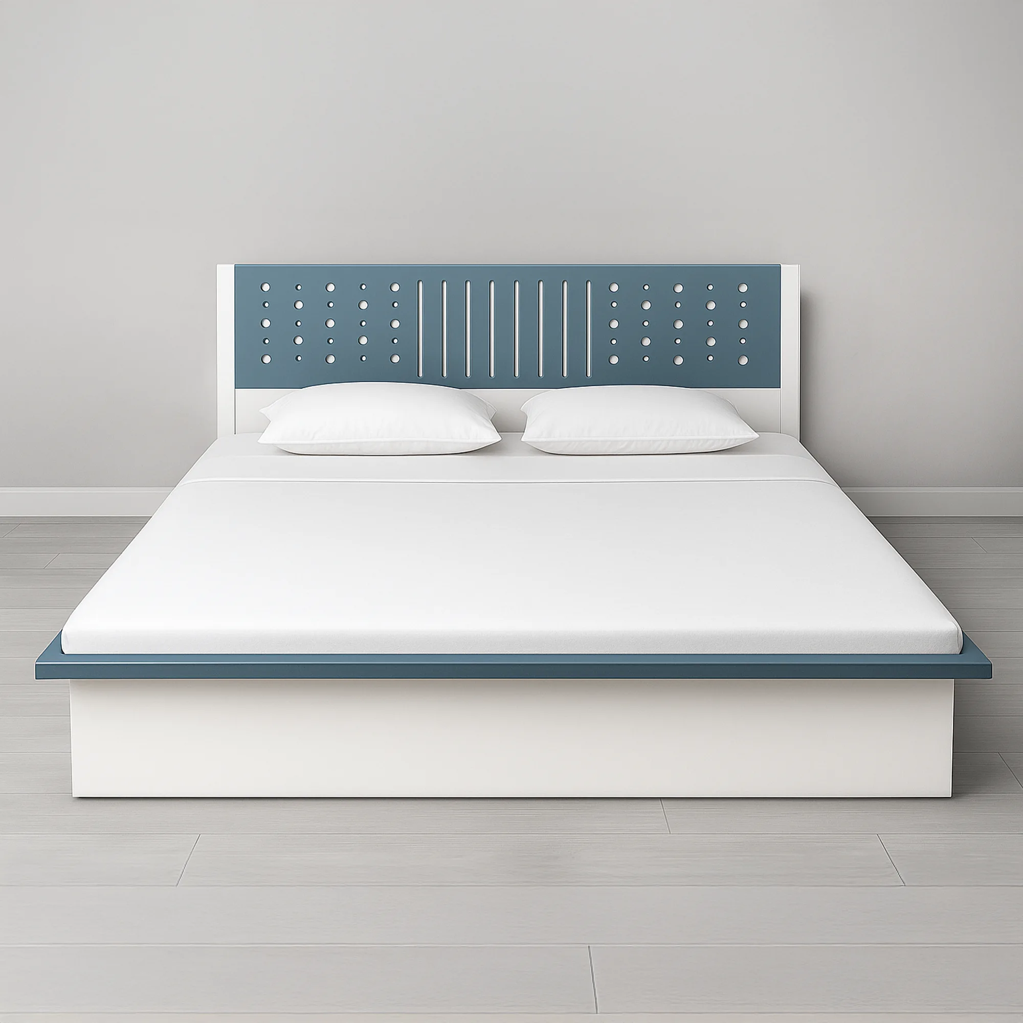 The defining feature is its captivating designer headboard, which combines a crisp white finish with a calming dusty blue accent panel. This artistic headboard showcases a geometric pattern of perforated circles and elegant vertical slats, creating visual interest and a sense of bespoke craftsmanship.