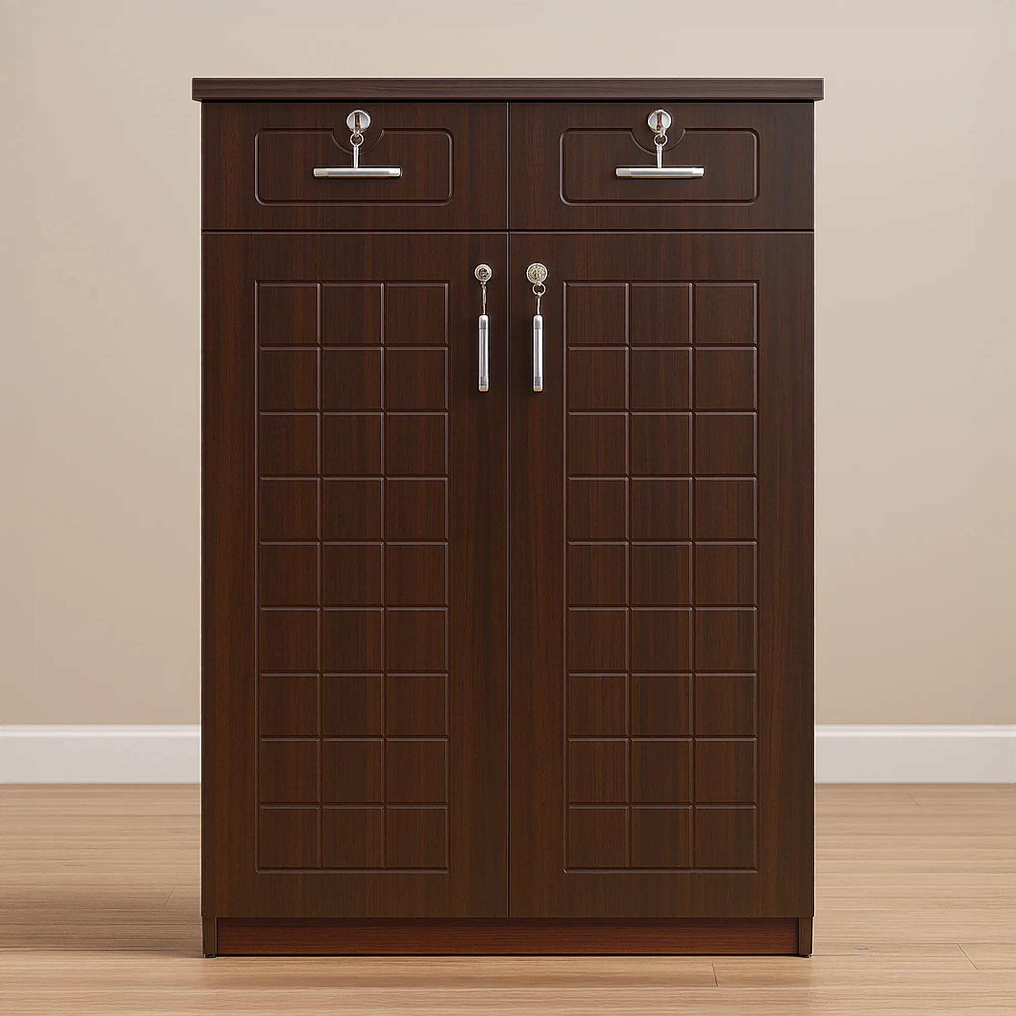The elegant design features a rich, dark wenge finish that beautifully mimics the texture of natural wood. Its standout feature is the contemporary grid-paneled doors, which add a touch of architectural detail and visual interest. Complemented by sleek, silver-finish handles and secure locks, this shoe cabinet seamlessly blends security with style.