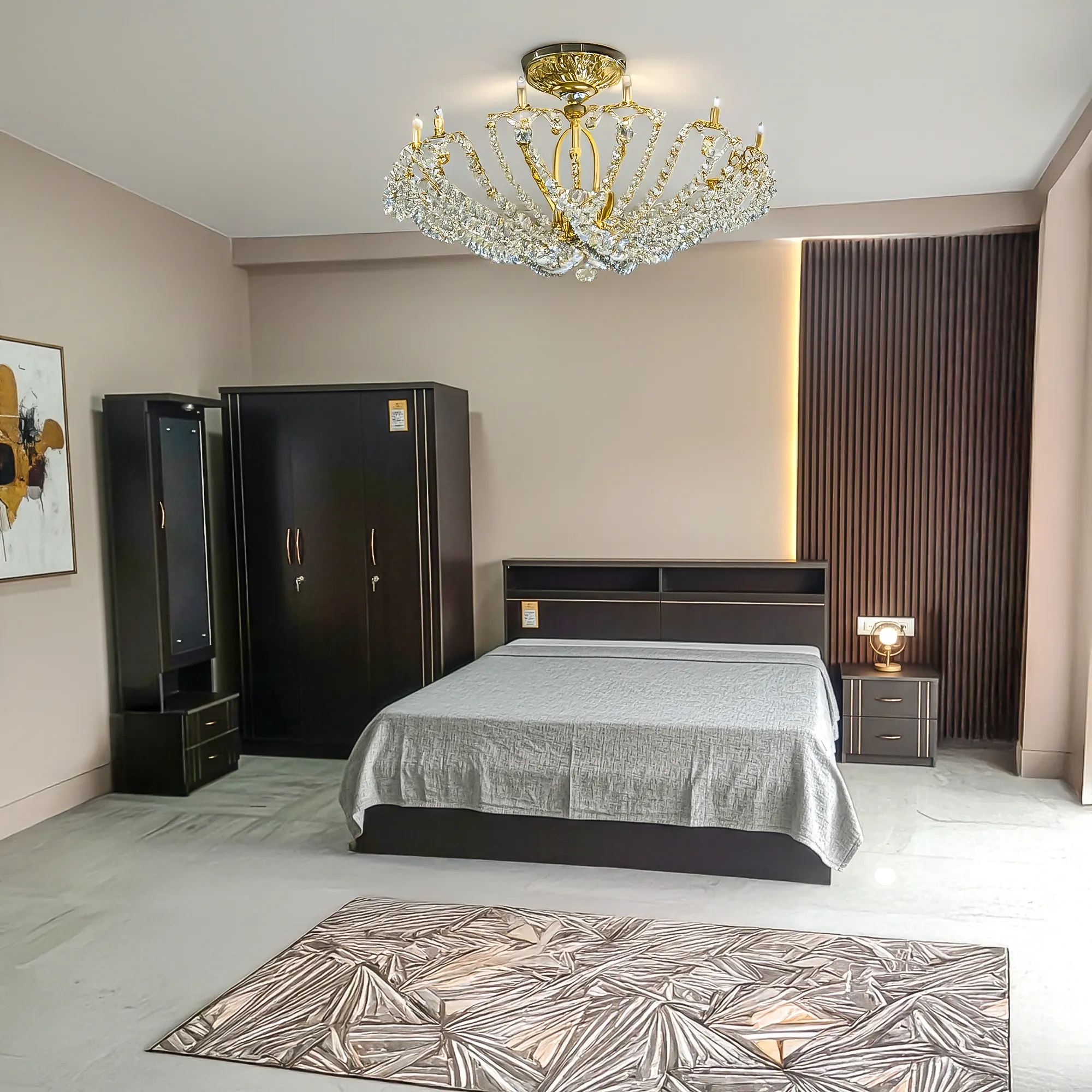 Discover the essence of understated luxury with the Sterling 4-Piece Bedroom Set. This impeccably designed collection offers a complete solution for creating a sophisticated, modern, and harmonious bedroom retreat. Finished in a deep, elegant wenge (dark espresso), the Sterling set is defined by its clean lines, minimalist forms, and the subtle elegance of its metallic accents.