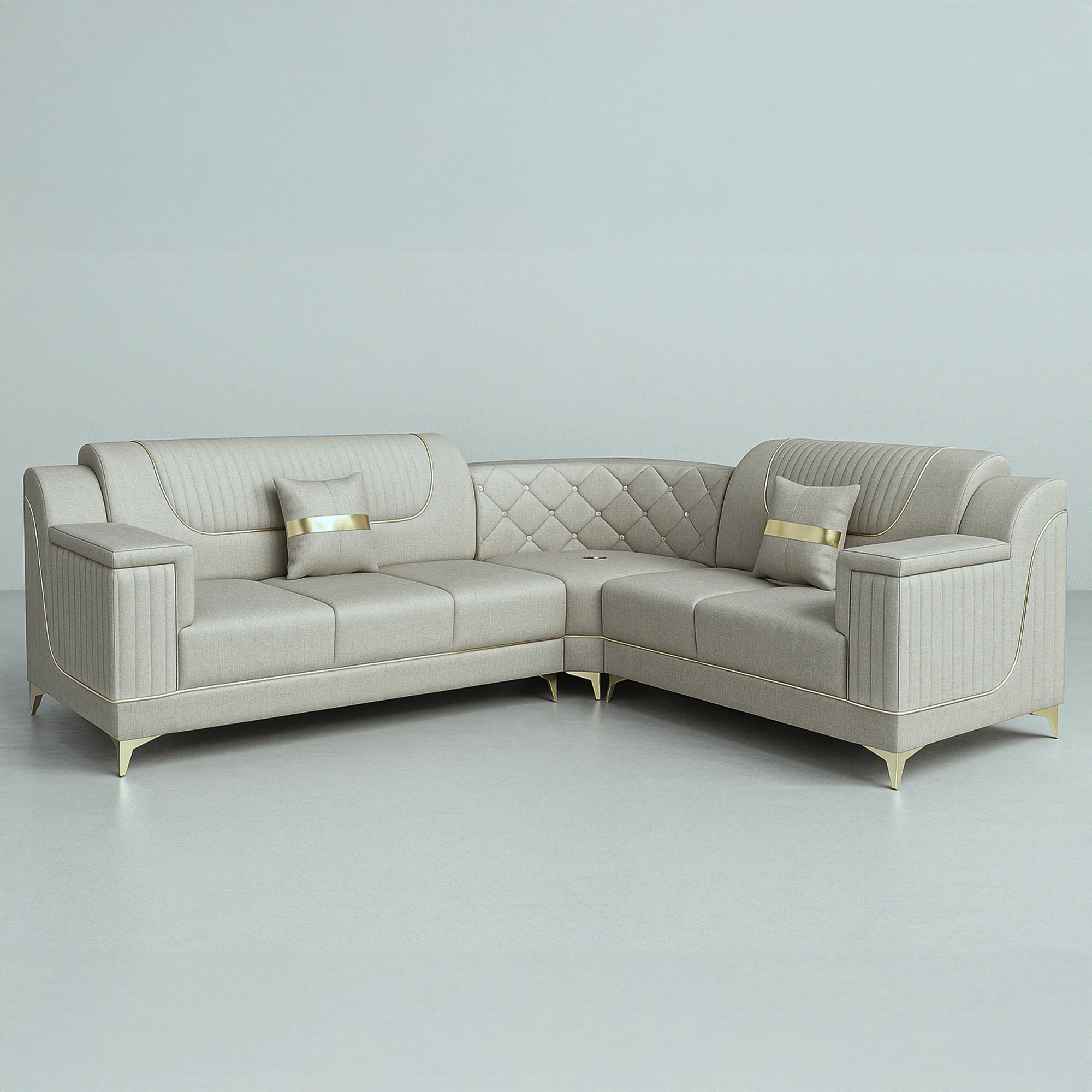 The Valencia sofa makes a breathtaking statement with its elegant, champagne-beige linen-weave fabric, which is beautifully contrasted by gleaming gold accents. Delicate gold piping traces the sofa’s refined curves, while the sculptural gold legs provide a chic, elevated foundation. The exquisite corner section features diamond tufting, each point punctuated with a subtle crystal button that catches the light and adds a touch of opulent sparkle.