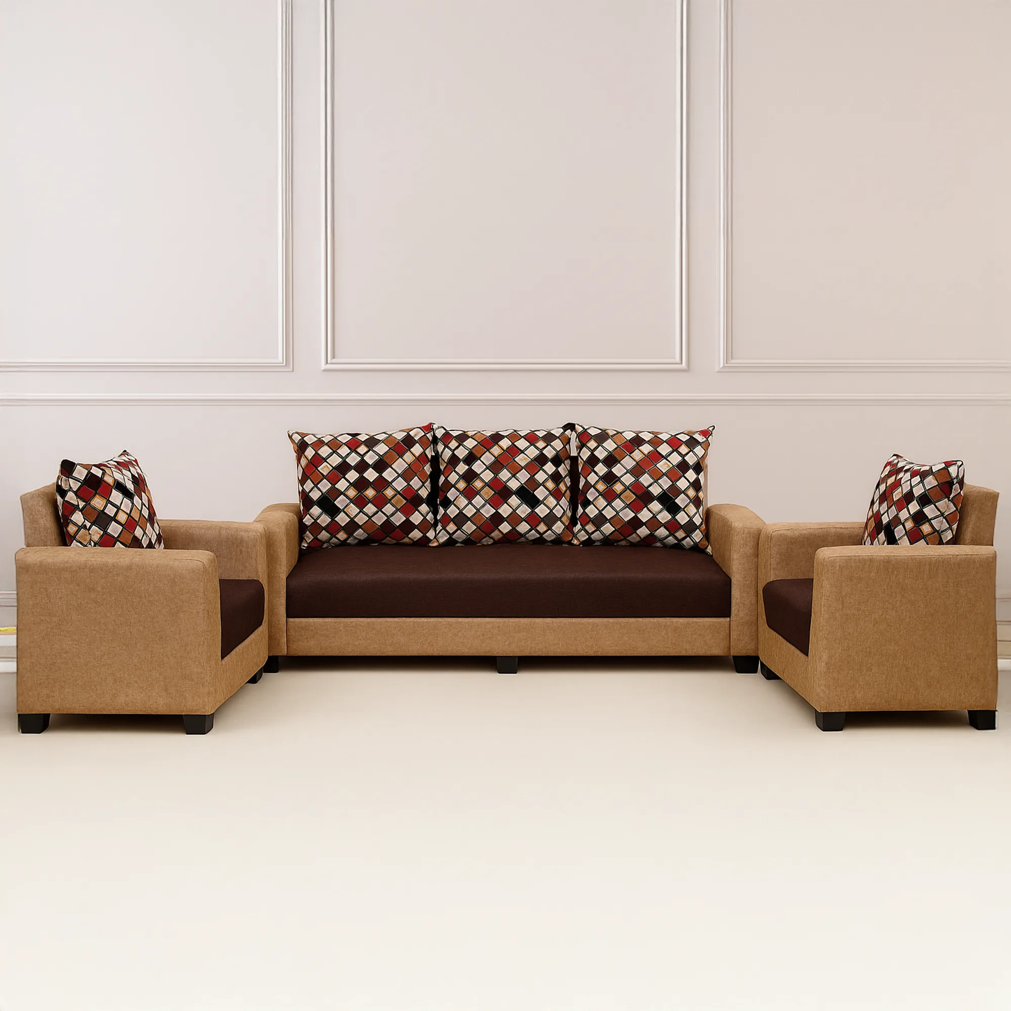 The Verona set features a stunning two-tone design, combining a warm, textured beige fabric on the frame with rich, chocolate brown seat cushions. This elegant contrast is complemented by clean lines and a contemporary block silhouette, making it a versatile centerpiece that seamlessly integrates with your existing decor.